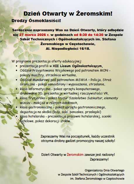 Opublikowano:10-04-20269 kwietnia 2026 r. uczniowie klas 3B pod opieką p. Agnieszki Pałygi oraz 3K pod opieką p. Jolanty Skórki uczestniczyli w drugiej części projektu Częstochowskiego Uniwersytetu Młodzieżowego. W czasie wizyty młodzież brała udział w ciekawych zajęciach i pokazach przygotowanych przez pracowników Politechniki Częstochowskiej. Czytaj dalej