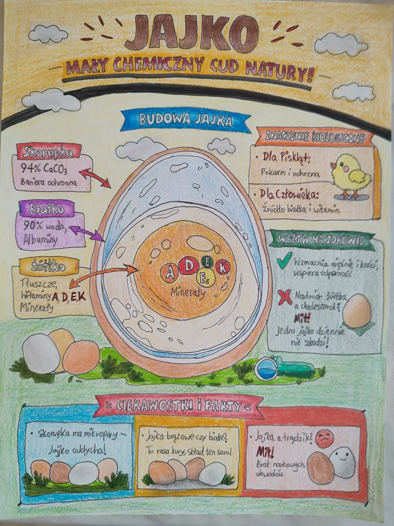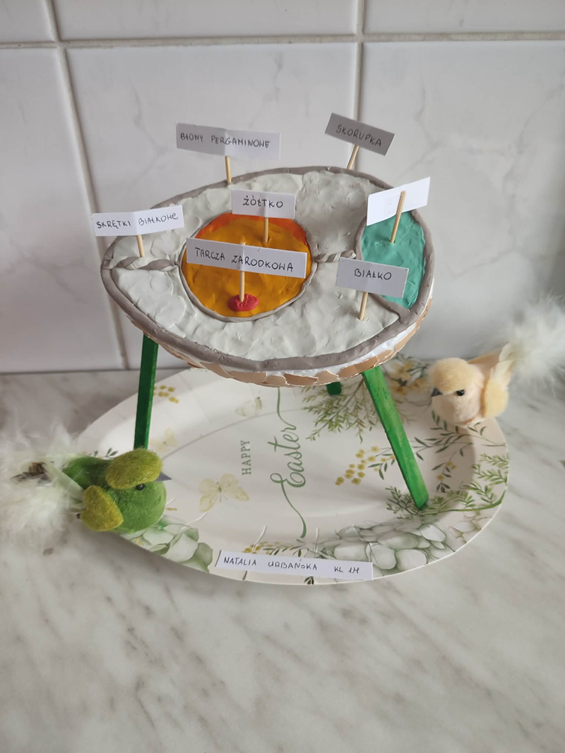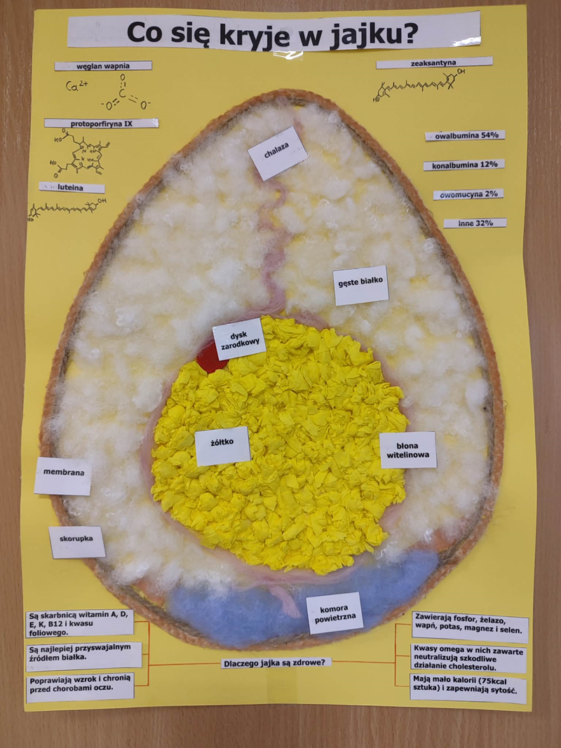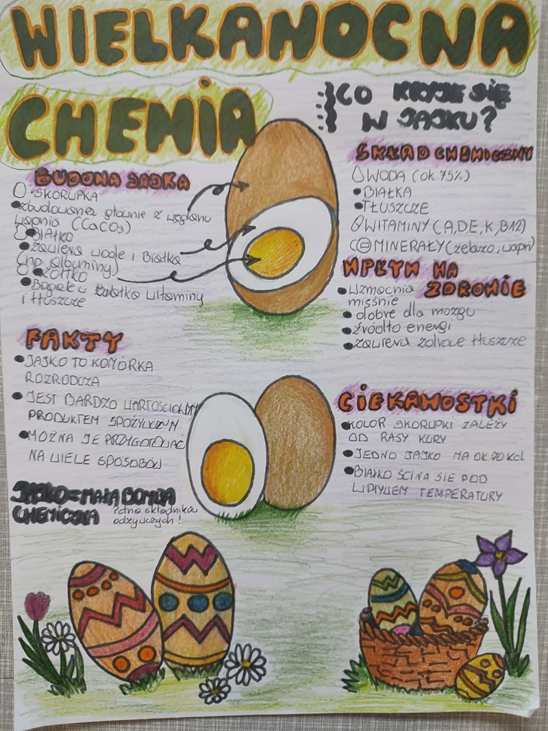 Nauczycielki chemii zaprosiły uczniów do wykonania prac plastycznych związanych z wielkanocnym jajkiem, ale od strony chemicznej: pod kątem jego budowy, składu chemicznego, wpływu na zdrowie człowieka. Mile widziane były również fakty i mity oraz różne ciekawostki związane z jajkiem. Formy prac były następujące: plakat, książeczka lub album oraz model przekroju jajka wraz z opisem składu. Pomysłowość i sposoby wykonania prac są bardzo interesujące, co widać na zdjęciach. Nauczycielki chemii bardzo dziękują wszystkim, którzy wzięli udział w konkursie i gratulują tym, którzy zostali wyróżnieni. Są to następujące uczennice i uczniowie: