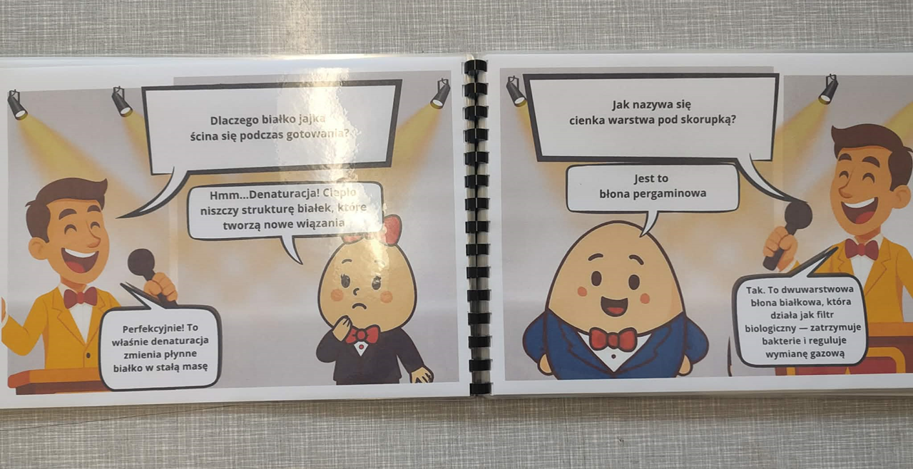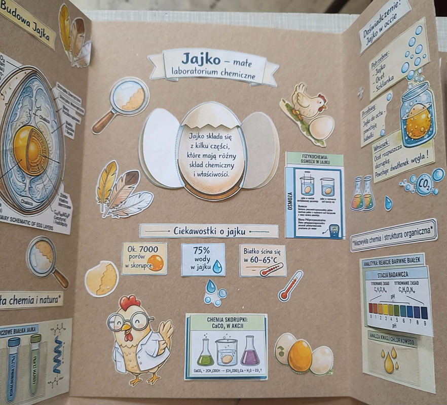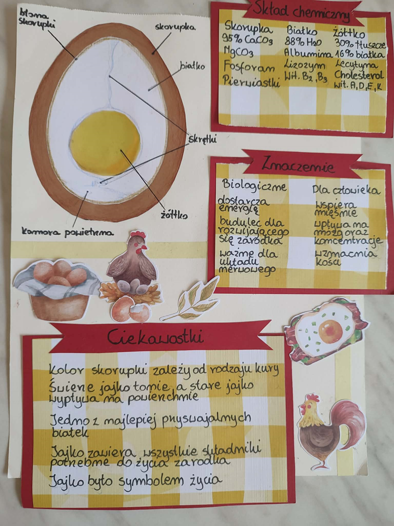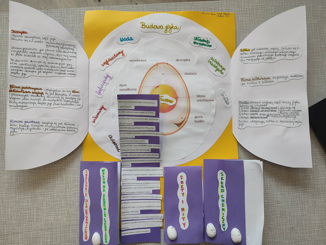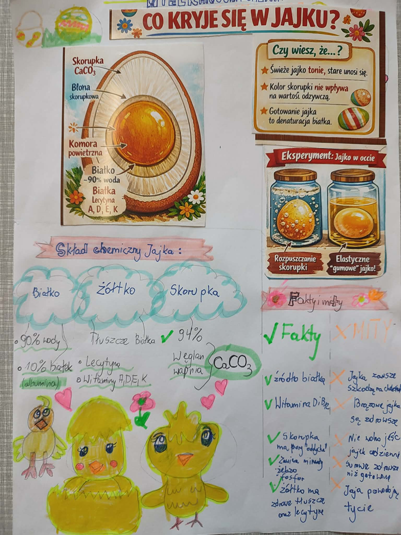 Nauczycielki chemii zaprosiły uczniów do wykonania prac plastycznych związanych z wielkanocnym jajkiem, ale od strony chemicznej: pod kątem jego budowy, składu chemicznego, wpływu na zdrowie człowieka. Mile widziane były również fakty i mity oraz różne ciekawostki związane z jajkiem. Formy prac były następujące: plakat, książeczka lub album oraz model przekroju jajka wraz z opisem składu. Pomysłowość i sposoby wykonania prac są bardzo interesujące, co widać na zdjęciach. Nauczycielki chemii bardzo dziękują wszystkim, którzy wzięli udział w konkursie i gratulują tym, którzy zostali wyróżnieni. Są to następujące uczennice i uczniowie: